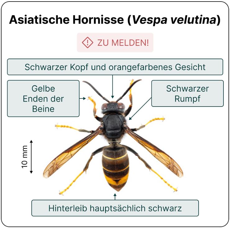 Im Frühling beginnen die Königinnen der Asiatischen Hornisse (Vespa velutina nigrithorax) mit dem Bau von Primärnestern. Diese sind klein, meist kugelförmig und befinden sich häufig an wettergeschützten Orten im Siedlungsgebiet, zum Beispiel unter Vordächern, bei Garagen und Unterständen, an Gebäuden sowie in Hecken und Büschen. In den kommenden Wochen sind diese Primärnester besonders gut erkennbar.
